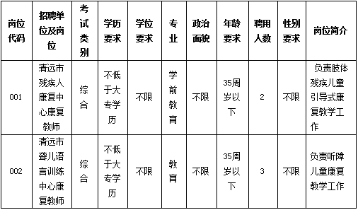 清遠市殘疾人康復(fù)中心、清遠市聾兒語言訓(xùn)練中心,是市殘聯(lián)直屬公益一類事業(yè)單位,是專門為0-6歲殘障兒童康復(fù)的機構(gòu)。根據(jù)工作需要招聘康復(fù)教師5名(屬非編制人員,不列入用人單位編制序列,不擔任行政職務(wù)),現(xiàn)將有關(guān)事項公告如下: